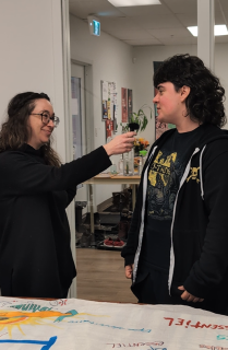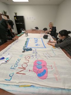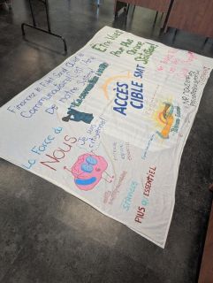 À la suite de ce moment, nous avons peint une bannière collective, portant les mots des membres de l'équipe et des personnes que nous accompagnons envers le communautaire et aussi ce que l’on souhaite y voir fleurir. Cette bannière a été apportée par des membres de l'équipe jusqu’à Québec, brillant fièrement devant l'Assemblée Nationale lors du rassemblement pacifique du 2 avril 2026.